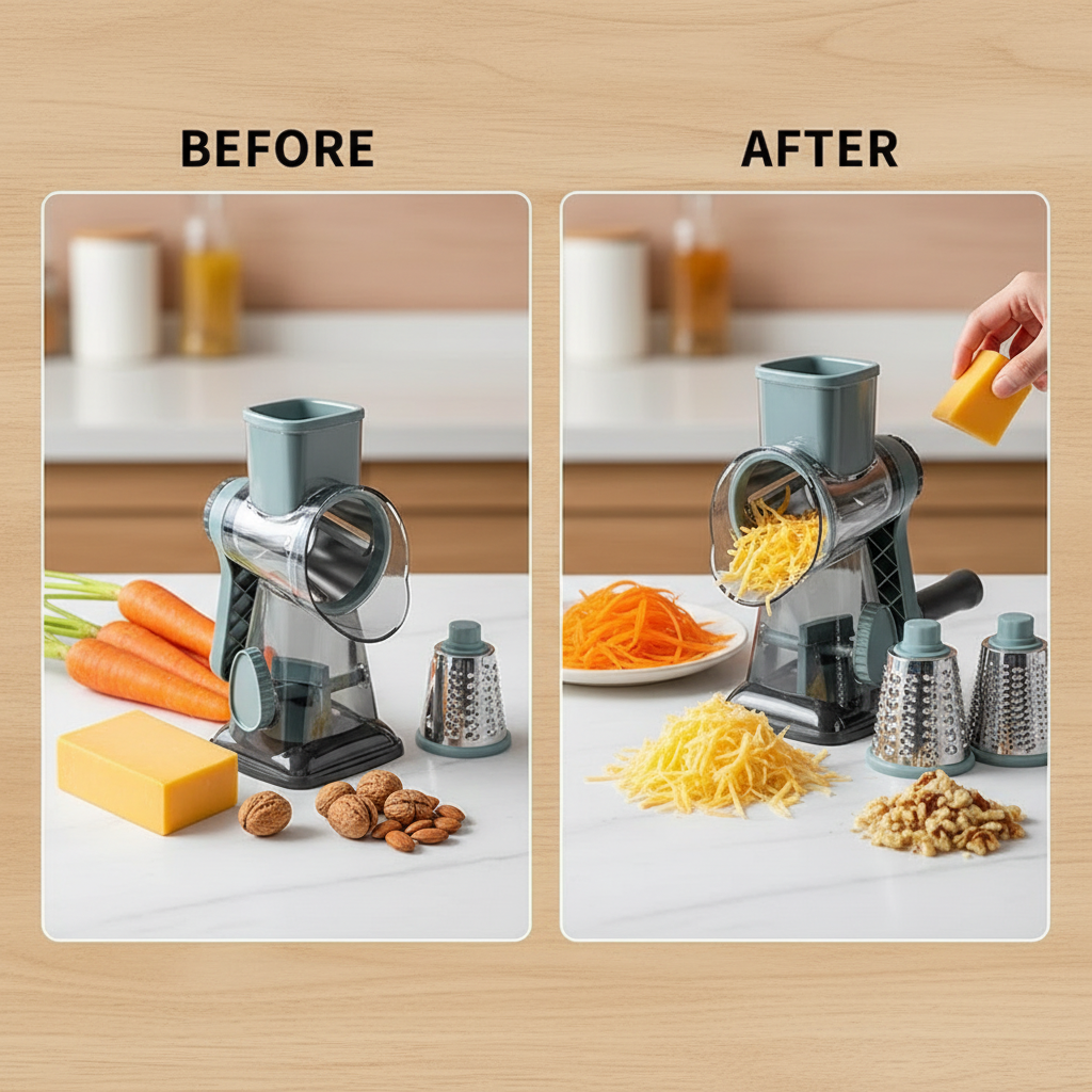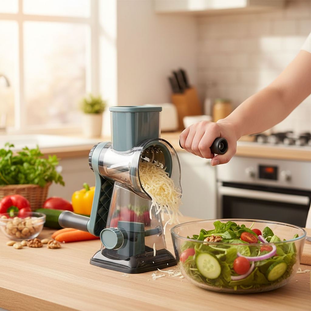 Transformez légumes et fromages en perfection râpée. 3 lames pros, sécurité totale, résultats impeccables. Cuisinez comme un chef enfin.